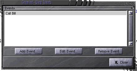 Gnomind has three main screens that will interact with the user.  The first is the View Events dialog box (See Figure 1).  This window allows the user to add, remove, and edit events.